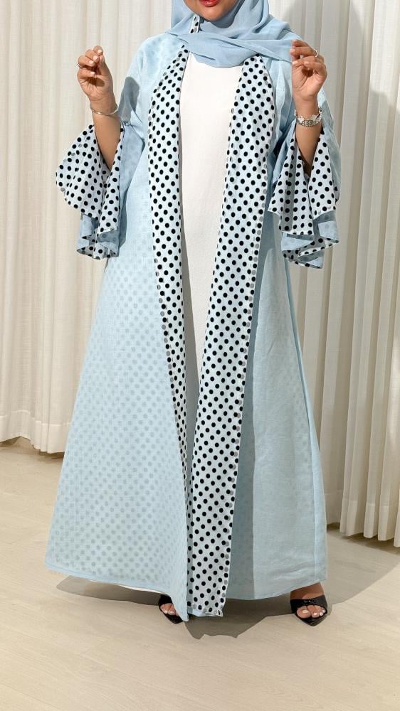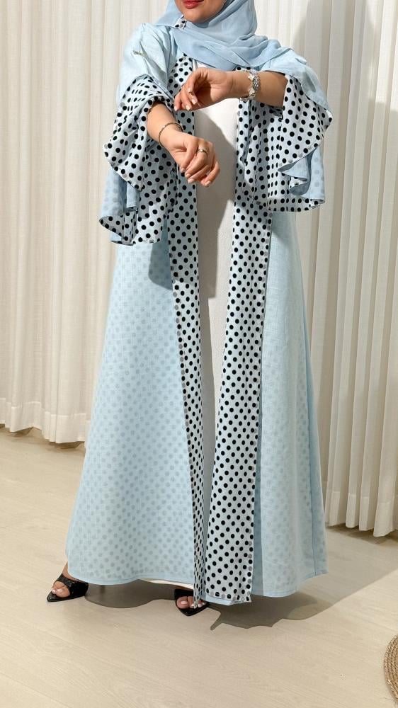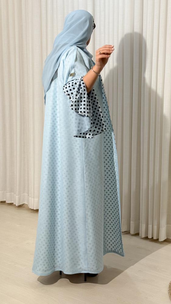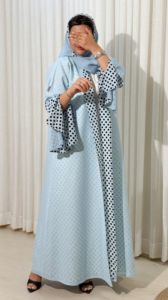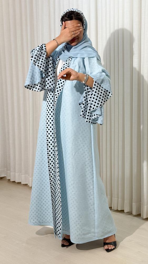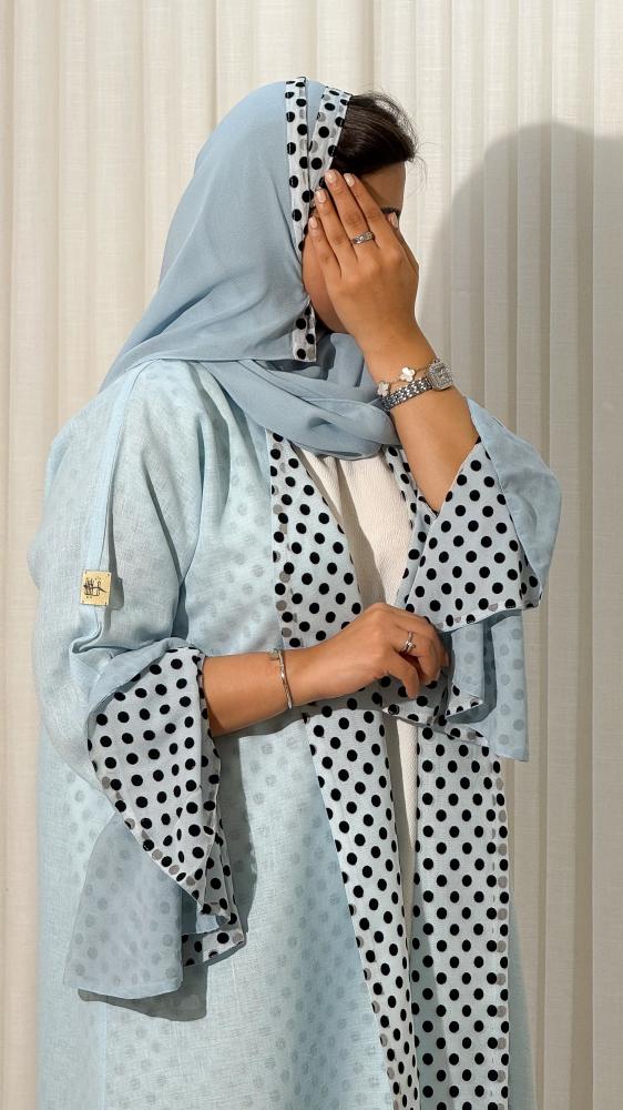 القصه : لف قماش لنن سماوي مبطنه بالدانتيل المنقط بالأسود مع كم فرنسي